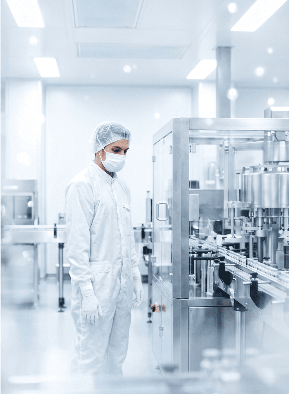 автоматизированная линия приготовления ГЛФ: лиофильные сушильные установки; моноблок наполнения и укупорки резиновой пробкой и(или) алюминиевым колпачком в асептических условиях стеклянных флаконов типа 4R, 6R, соответствующими пробками и колпачками; сухожаровые и паровые стерилизаторы; установка для стерилизующей фильтрации.